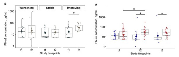 Изначально в группе пациентов с COVID-19 уровень интерферона-альфа был в 3,8 раза ниже, чем в контрольной группе. По мере выздоровления и уменьшения тяжести COVID-19 у людей значительно повышалось в крови содержание ИФН-альфа. У умерших пациентов уровень ИФН-альфа оставался низким на всем протяжении болезни.